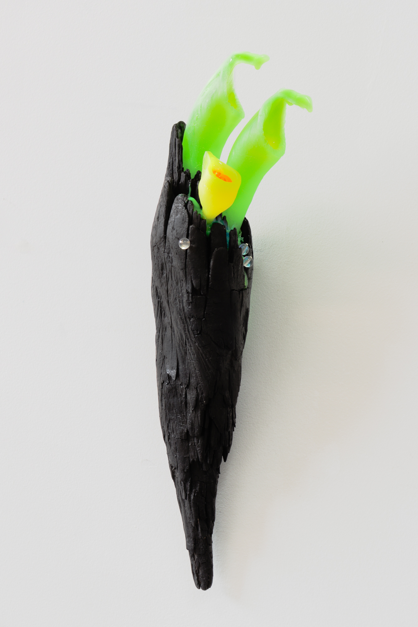 Sink Or Shiver (2022) is a series sculptures exhibited with Zalucky Contemporary. Sink Or Shiver is composed of charred pine, electric pigments mixed by the artist, and resin cast, cupped hands and bent knees. The artists hands and knees are inset into holes in the charred planks. The hollow shells in multi-coloured resins, become egg-like emergences from the charred wood.